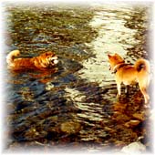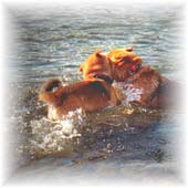 | じょうは泳げないので、ロッキーのひろってきたボールを岸で横取りです。 「がうがう。」 |