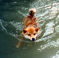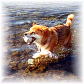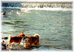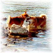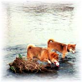 | じょうは泳げないので、ロッキーのひろってきたボールを岸で横取りです。 「がうがう。」 |