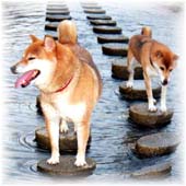 | じょうも一度はロッキーについて浅瀬をお散歩。 でも深入りすると自分だけ戻れない。 「キュ〜ン、キュ〜ン。」 |