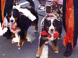 | ♪サンバのリズムに合わせて♪♪ ばーにーと音音ちゃんが荷車ひき、 そしてサラが荷車の上で歓声にこたえます。。。 沿道のたくさんの人に「かわいい〜♪」を言ってもらいました。 |
