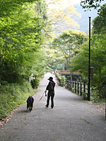駐車場に車をとめて、 河津川のほとりをてくてく。 最後の滝まで40分くらい。 えーっ! 『伊豆の踊り子像』のある 初景滝までなら10分位って聞いて 一安心。 いざ、出発! 結局、4つの滝を見たよ。 川沿いの道は木陰が多くて気持ちいいよ。 |