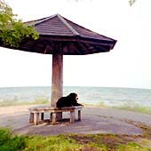 五月晴れ。 琵琶湖の浜にたたずむ・・・。 新旭の風車村の近くの浜。 久方ぶりの水にばーにー大はしゃぎ。 「頼むから、飛び込まないでね。」 ドキドキ・・・!! |